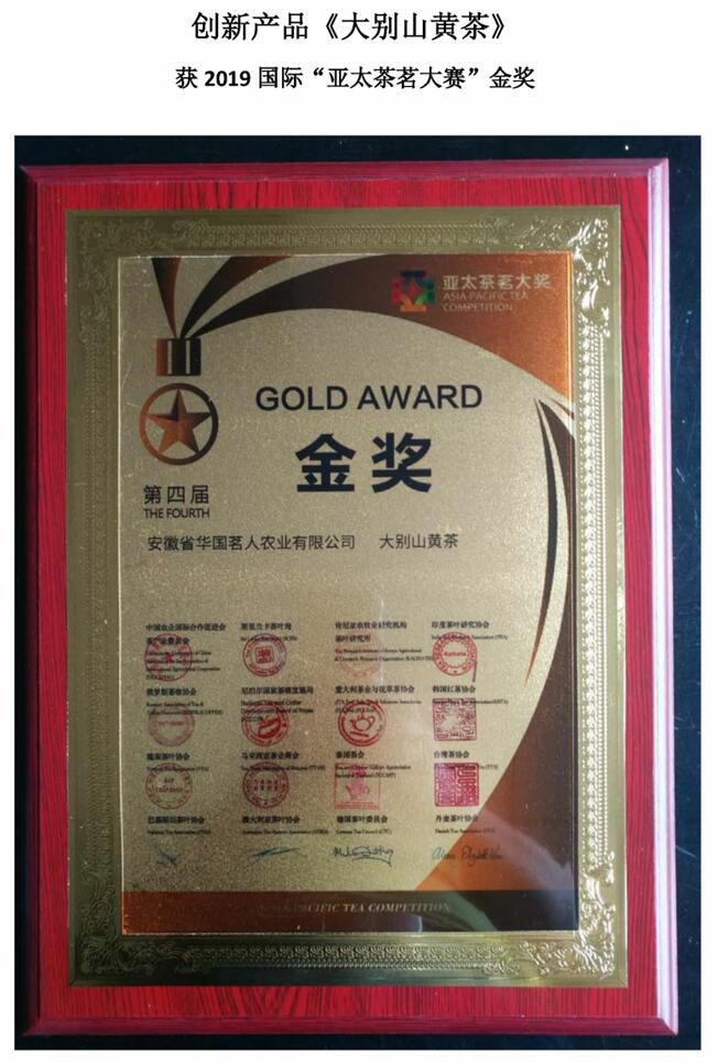 其中“安徽省華國(guó)茗人農(nóng)業(yè)有限公司”和“安徽省大別山茗茶小鎮(zhèn)農(nóng)業(yè)綜合開(kāi)發(fā)有限公司”傳承創(chuàng)新研發(fā)的《大別山黃茶》在第四屆亞太茶茗大獎(jiǎng)專家評(píng)審中外形、湯色、香氣、滋味等指標(biāo)進(jìn)行鑒定榮獲“第四屆亞太茶茗大會(huì)”金獎(jiǎng)產(chǎn)品榮譽(yù)。