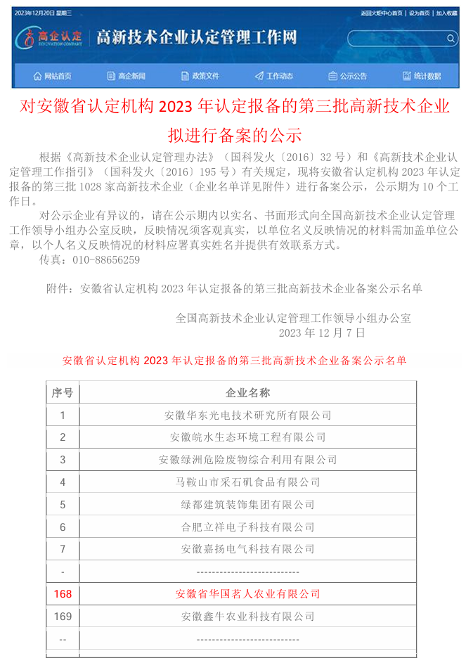 安徽茶葉企業(yè)【華國(guó)茗人公司】2023127日被“全國(guó)高新技術(shù)企業(yè)認(rèn)定管理工作領(lǐng)導(dǎo)小組辦公室”認(rèn)定公示為【國(guó)家高新技術(shù)企業(yè)】。是中國(guó)黃茶生產(chǎn)企業(yè)為數(shù)不多的榮獲高新企業(yè)榮譽(yù)。